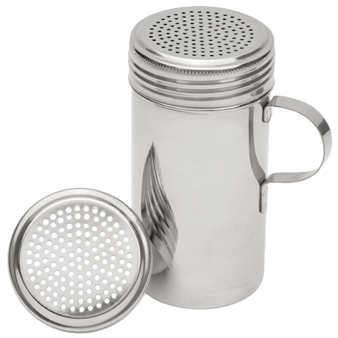 This Browne dredge is available in 2 capacities - 12 and 16 ounces. It has a stainless steel construction and a polished finish. It features a handle and the lid's holes are 1.9mm. Sometimes these items are called shakers, dredge sets, or dredgers.