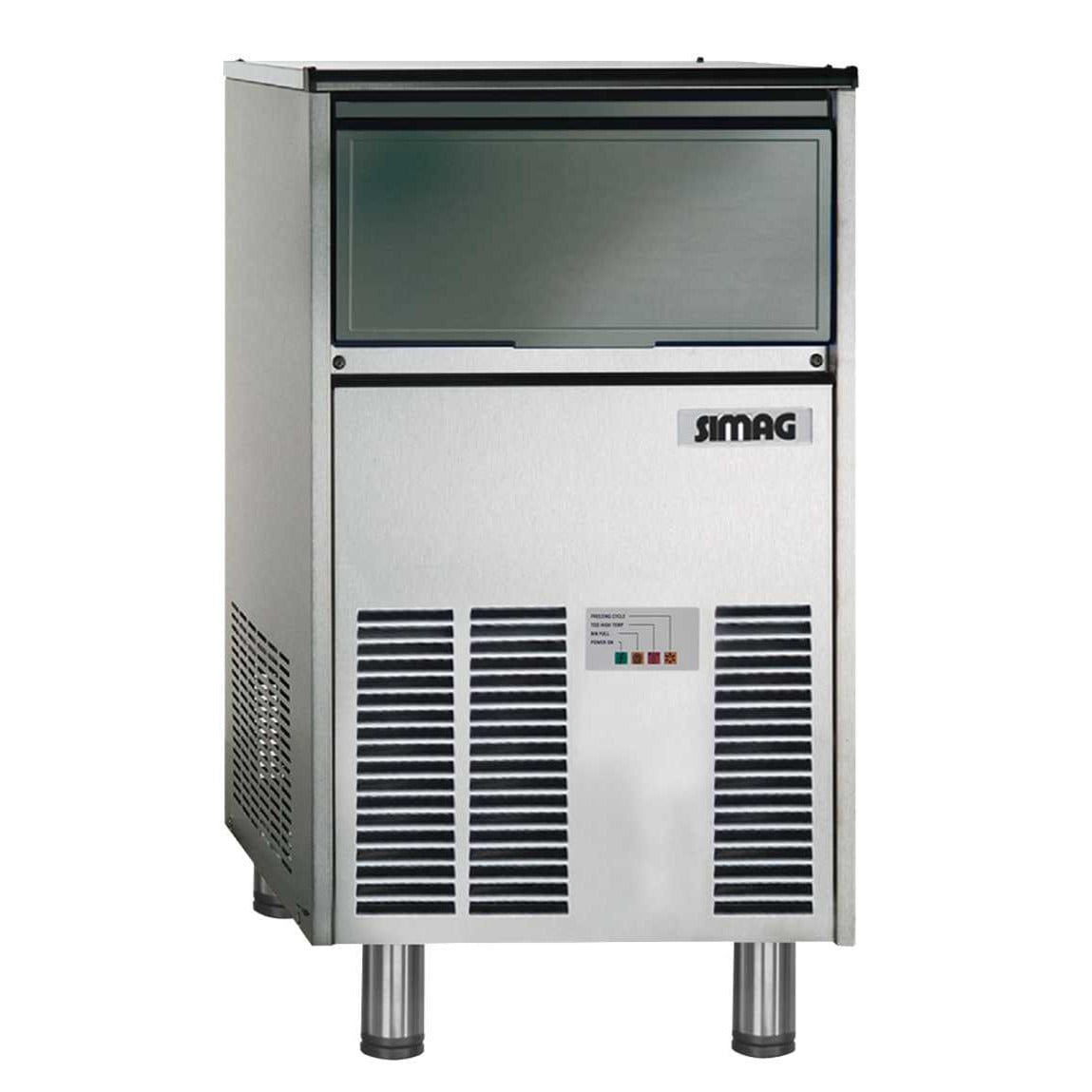 The Simag SCH30 is an undercounter ice machine with a compact profile. The dimensions (WDH) are 15.2” x 20.2” x 28.3”; and, paired with a self-contained R290 condenser and front-facing vents, it can be safely placed under most worktables. It is air-cooled, and its stainless steel body make it fit for any commercial environment.